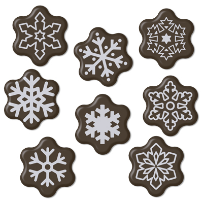 Готовый декор из темной шоколадной глазури в виде снежинок. С его помощью Вы легко и быстро украсите новогоднюю выпечку. Идеален для тортов и пирожных.